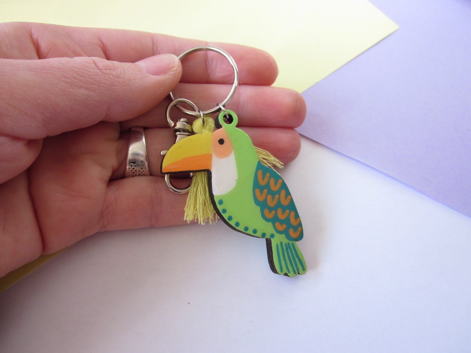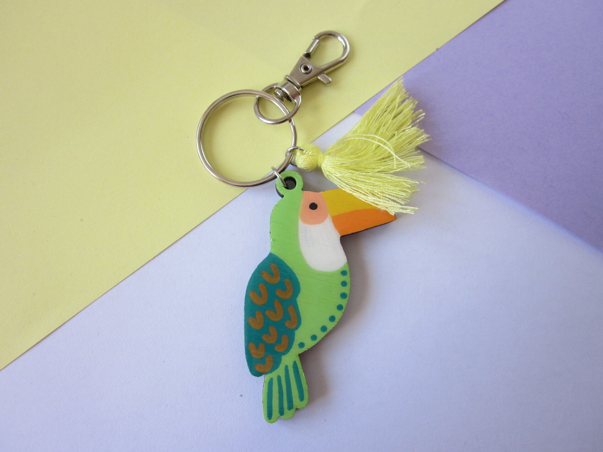 Porte-clés en bois - Toucan peint à la main - Vert et orange
