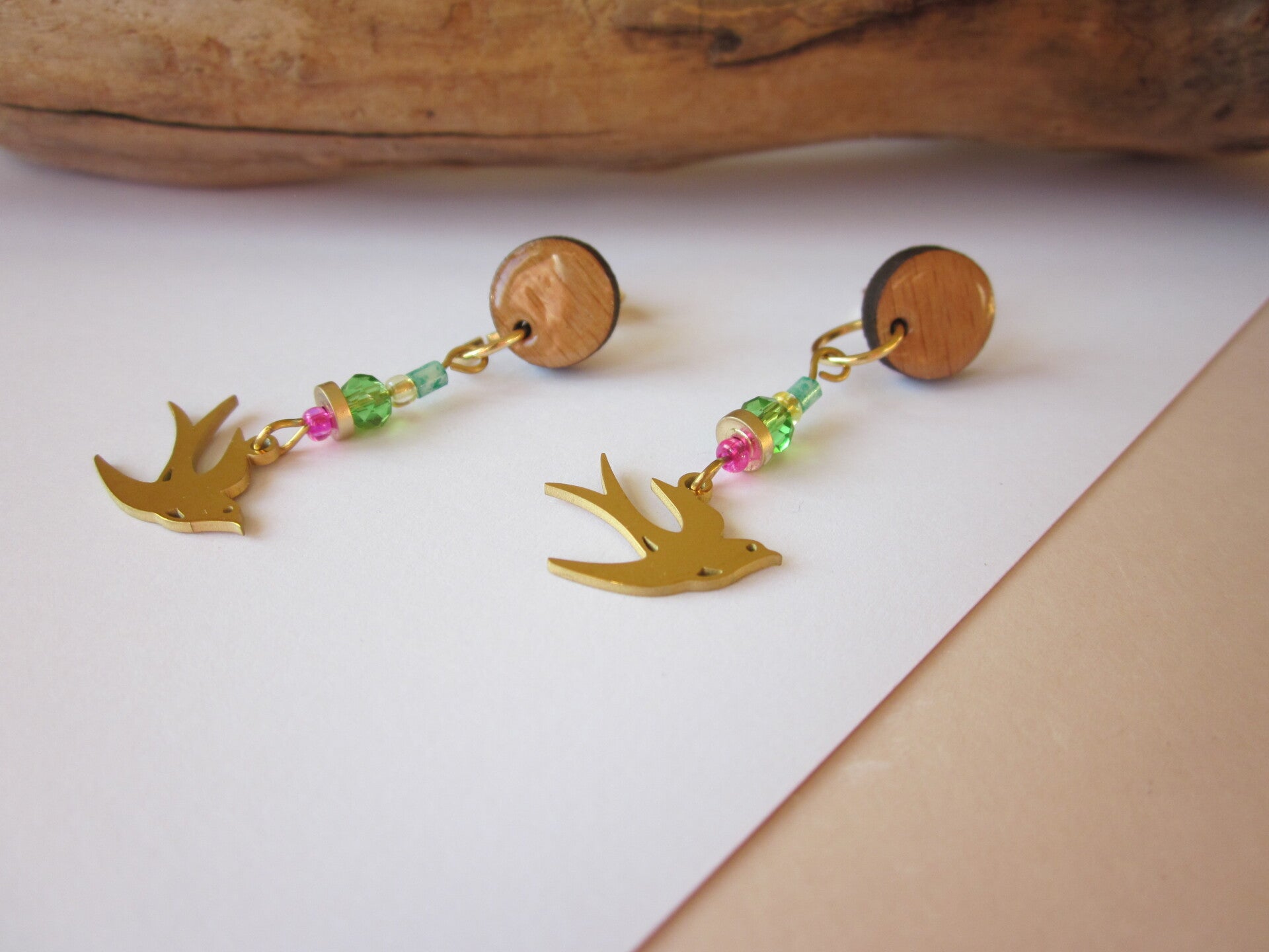 Boucles d'oreilles en bois - Colombe - Perles en verre