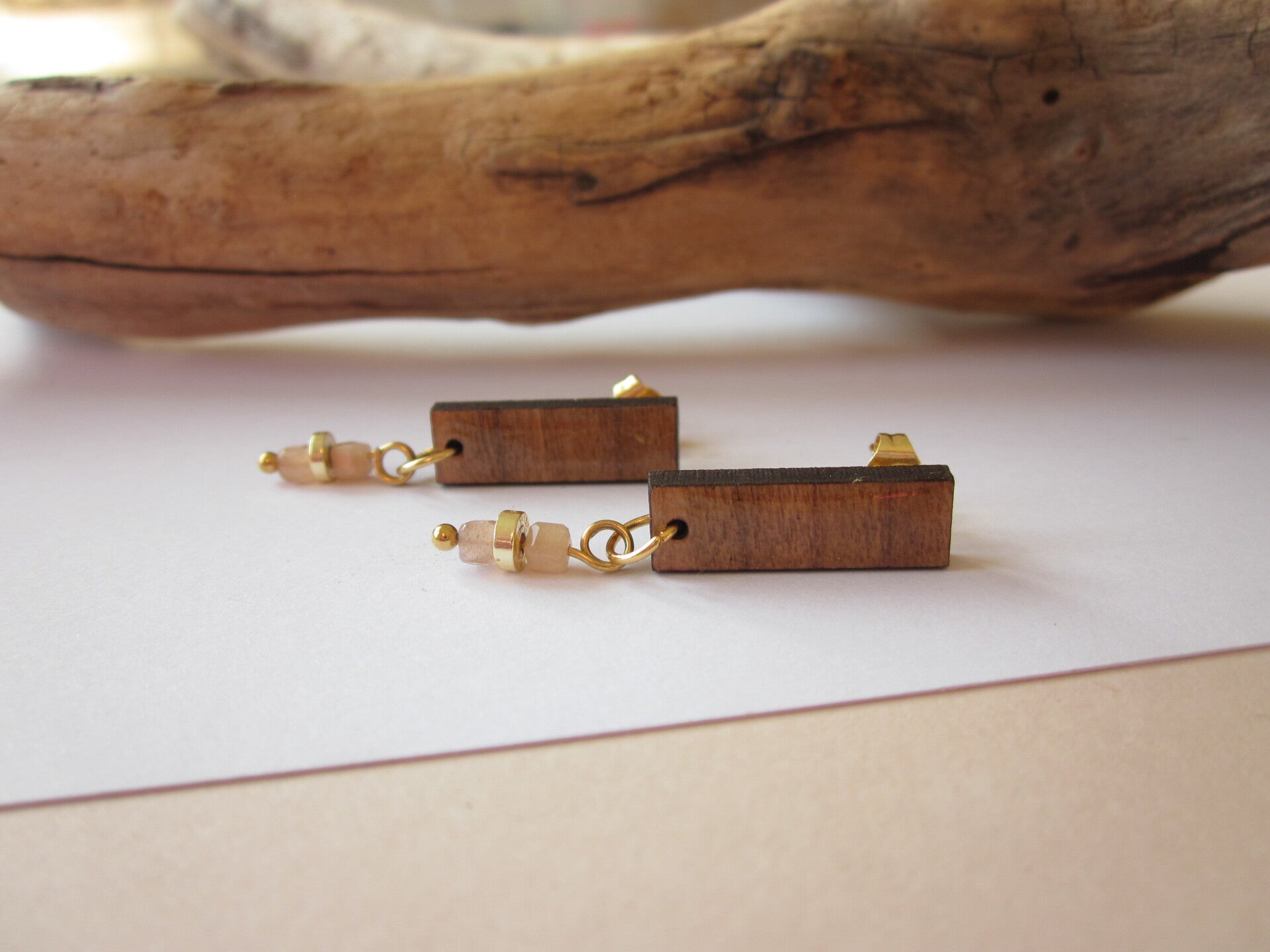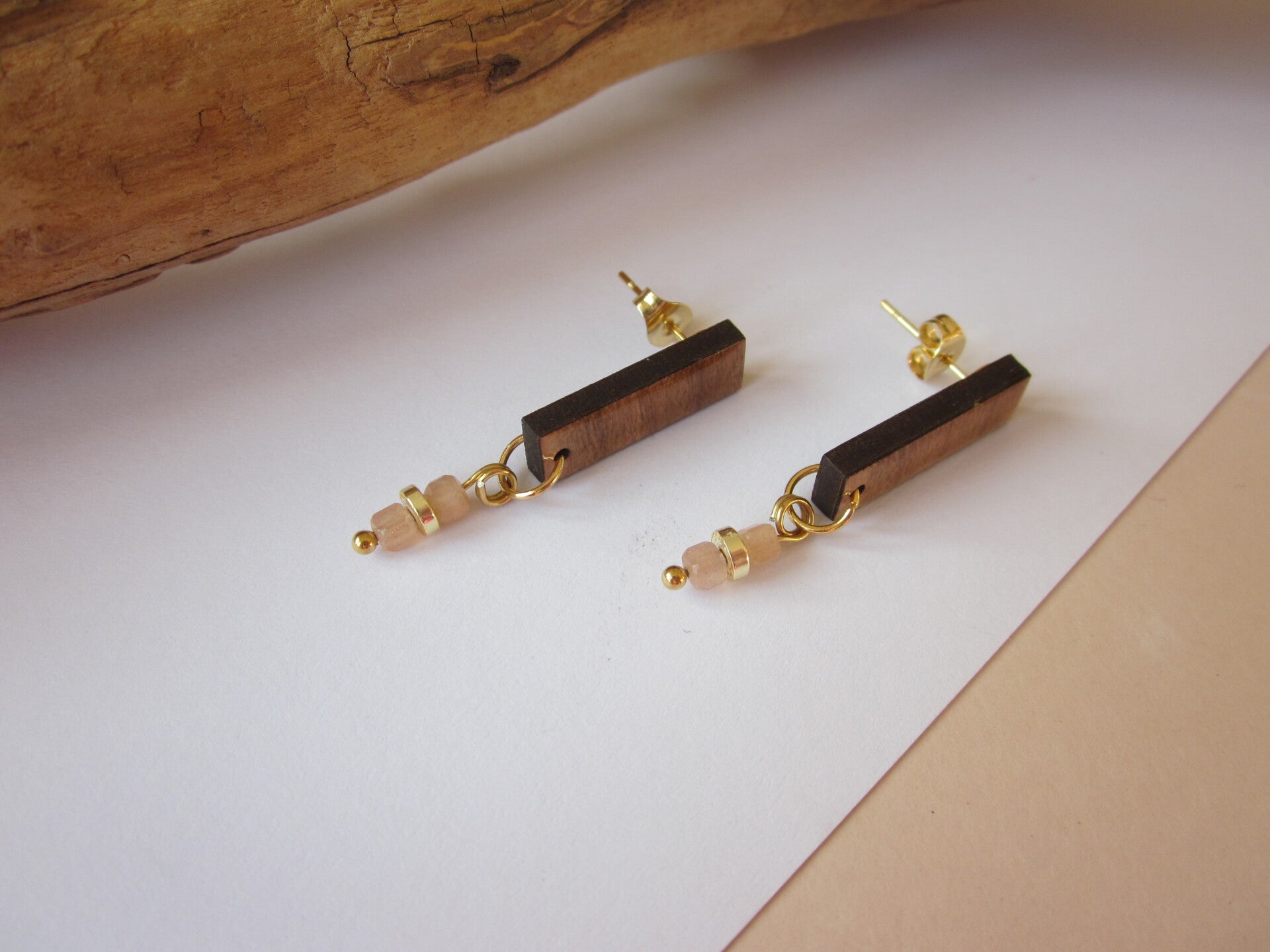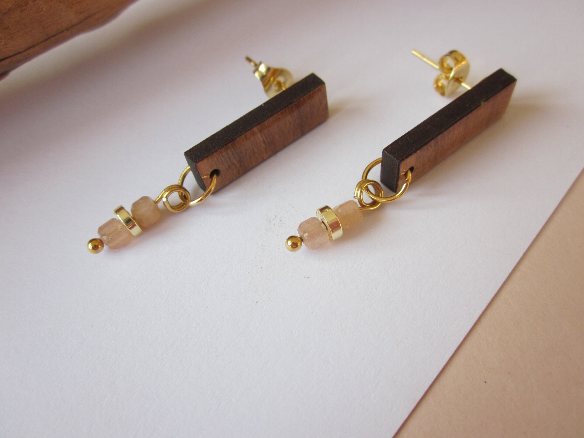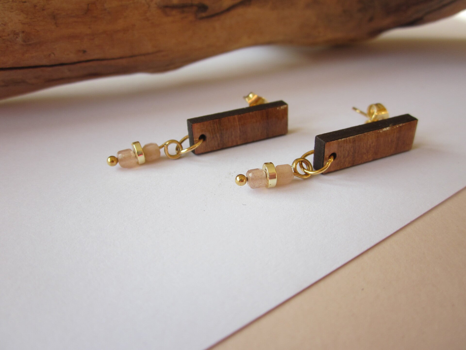 Boucles d'oreilles en bois - Perles en pierre - Pierre de soleil