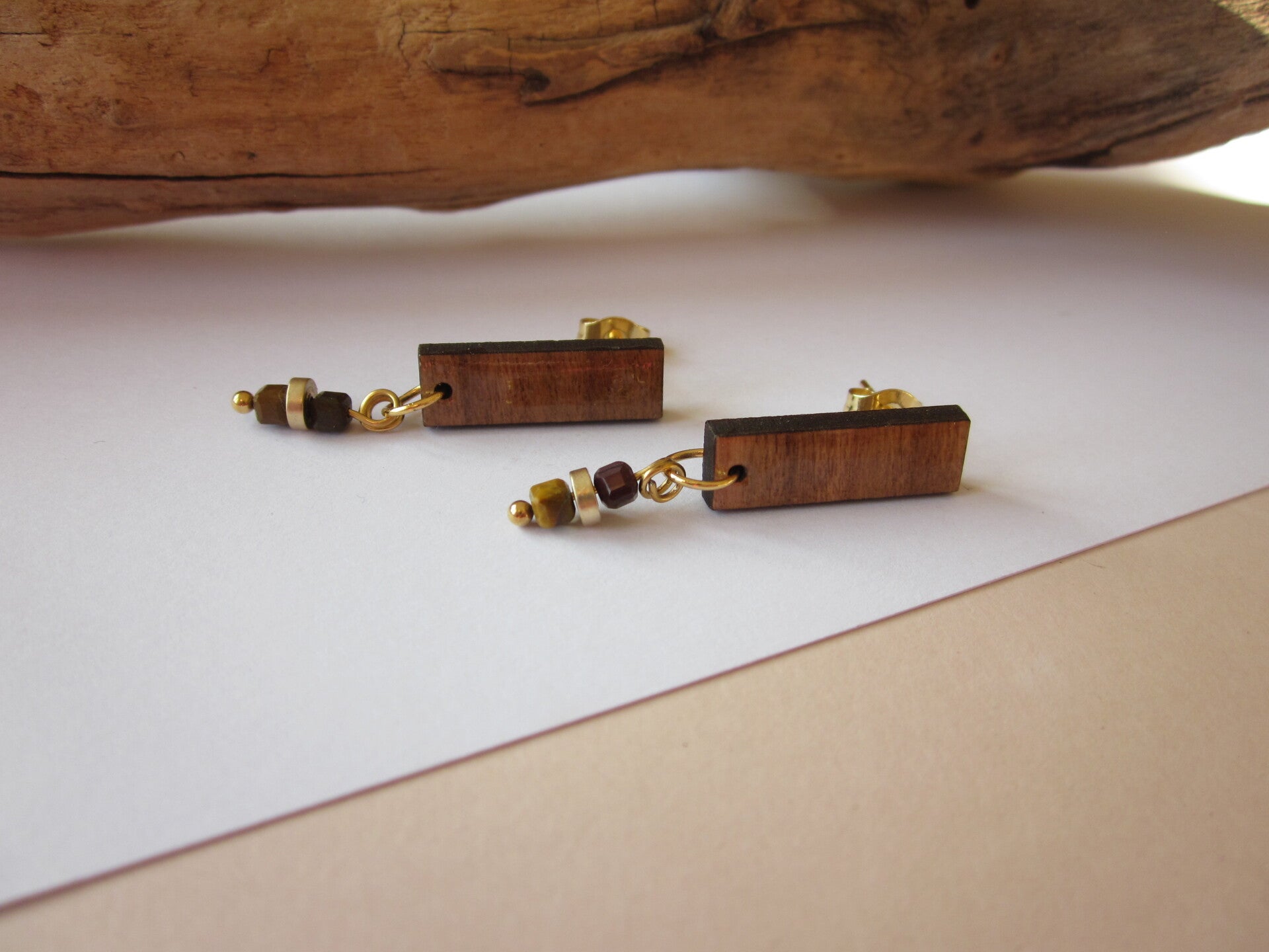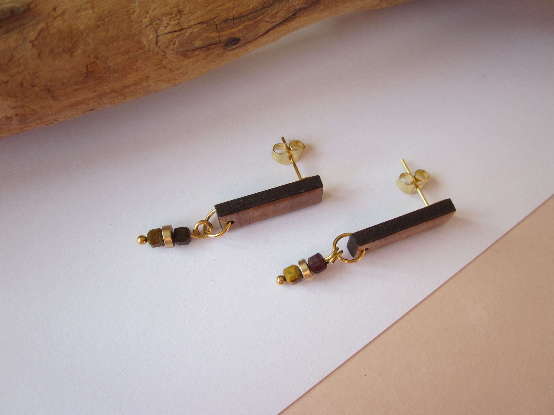 Boucles d'oreilles en bois - Perles en pierre - Oeil de tigre