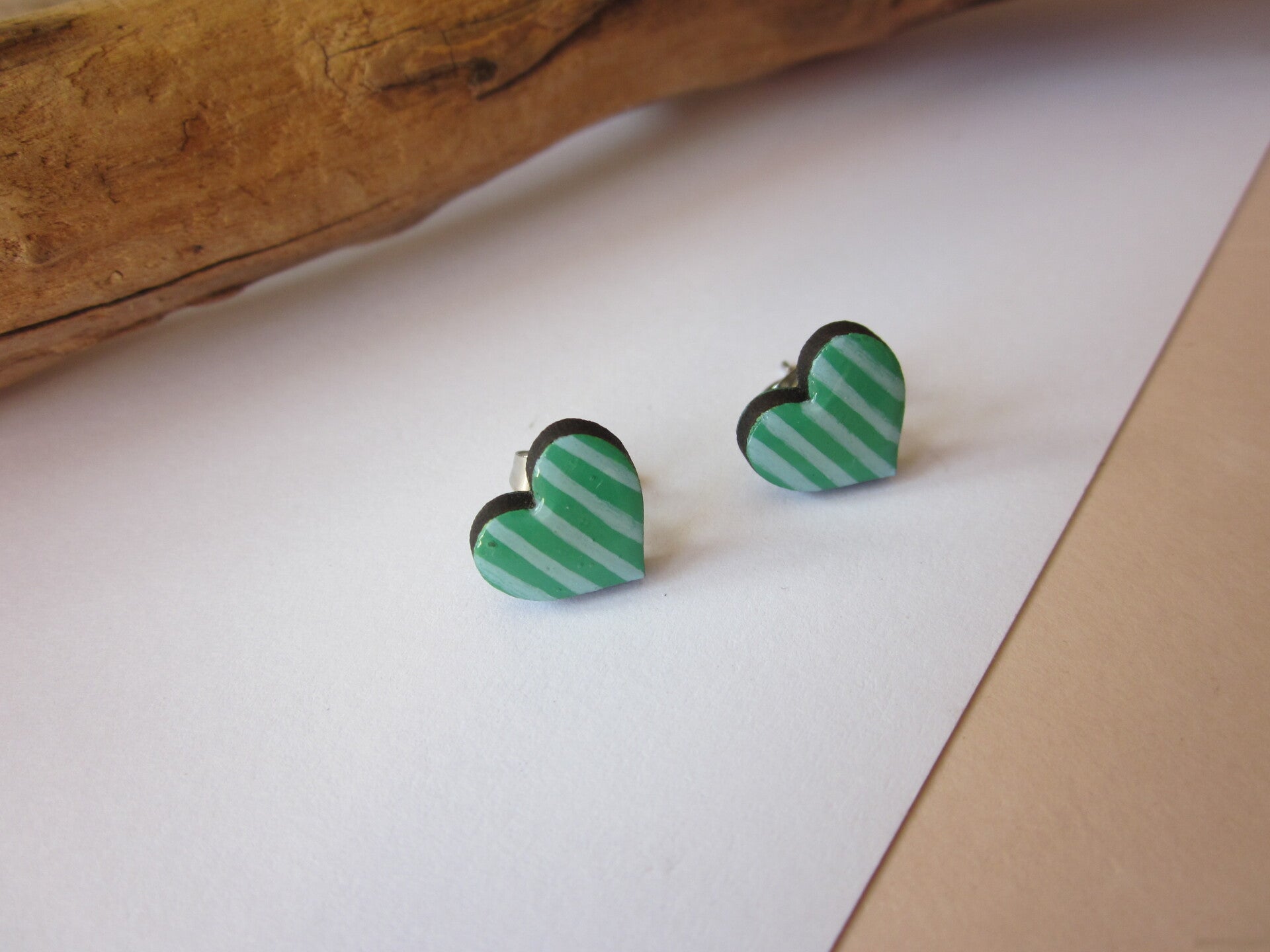 Boucles d'oreilles en bois - Coeur bleu et vert - Peint à la main