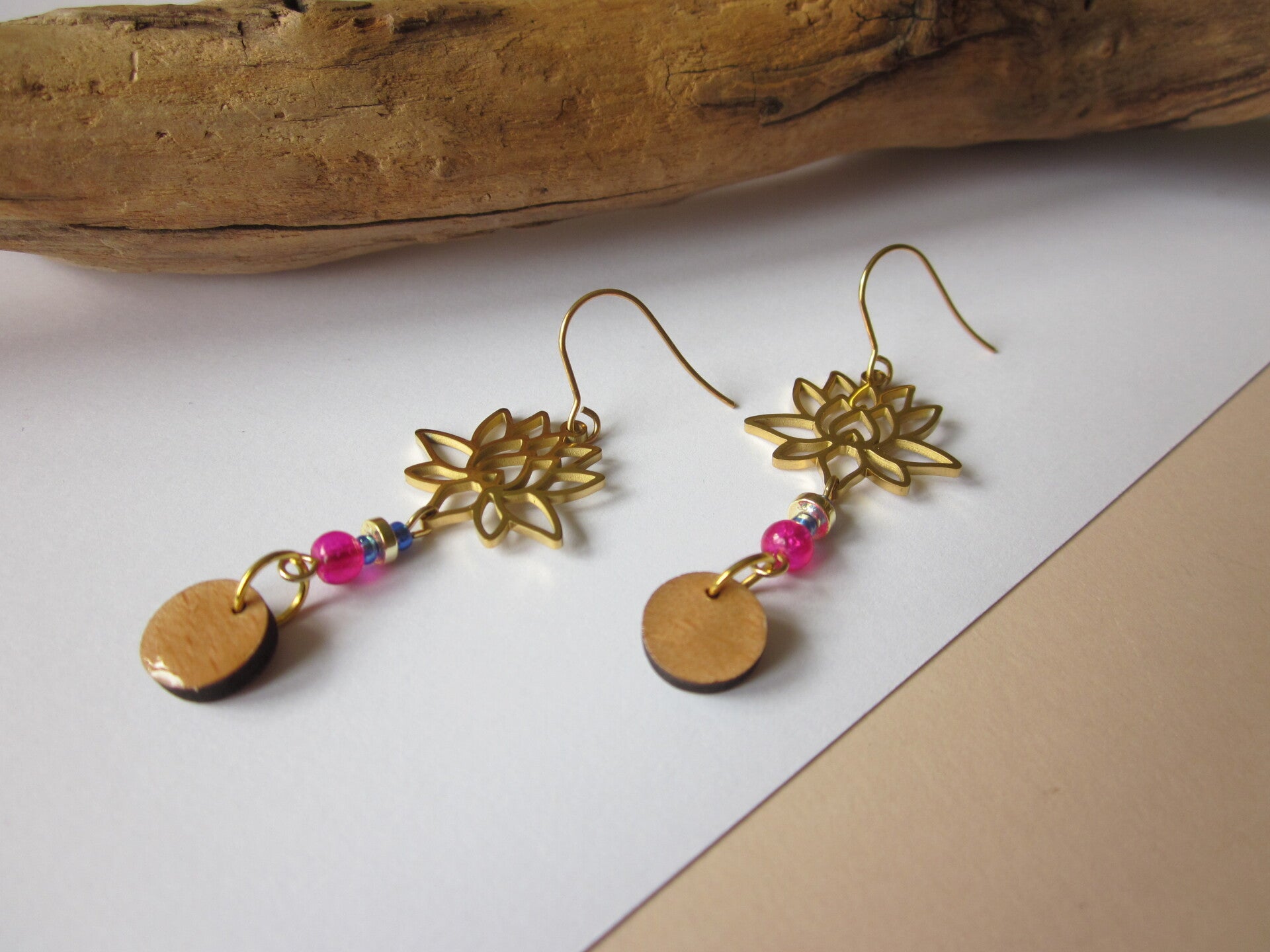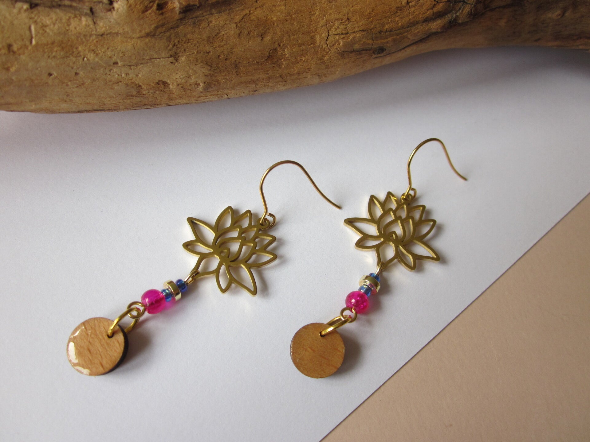 Boucles d'oreilles en bois - Fleur de Lotus - Perles en verre