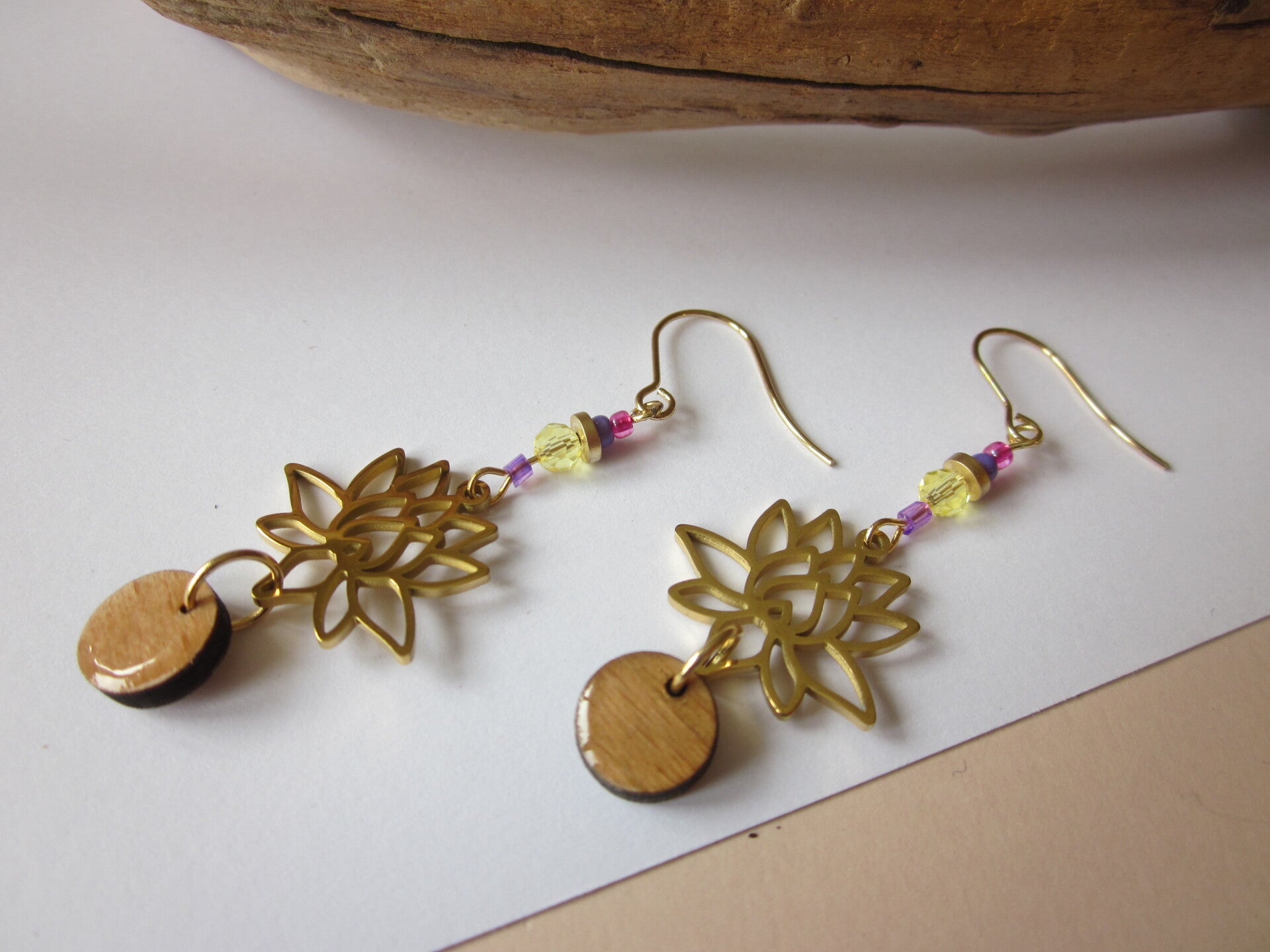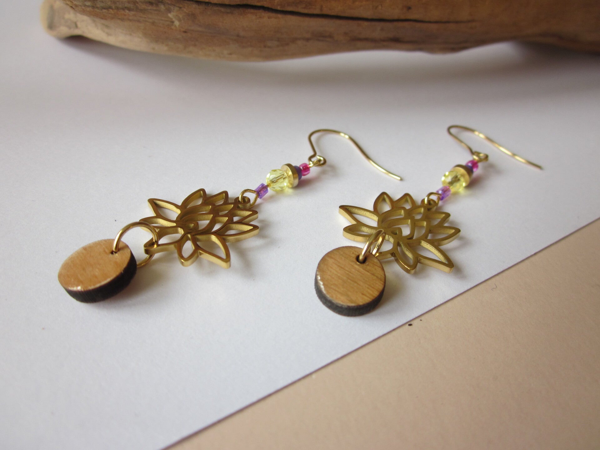 Boucles d'oreilles en bois - Fleur de Lotus - Perles en verre