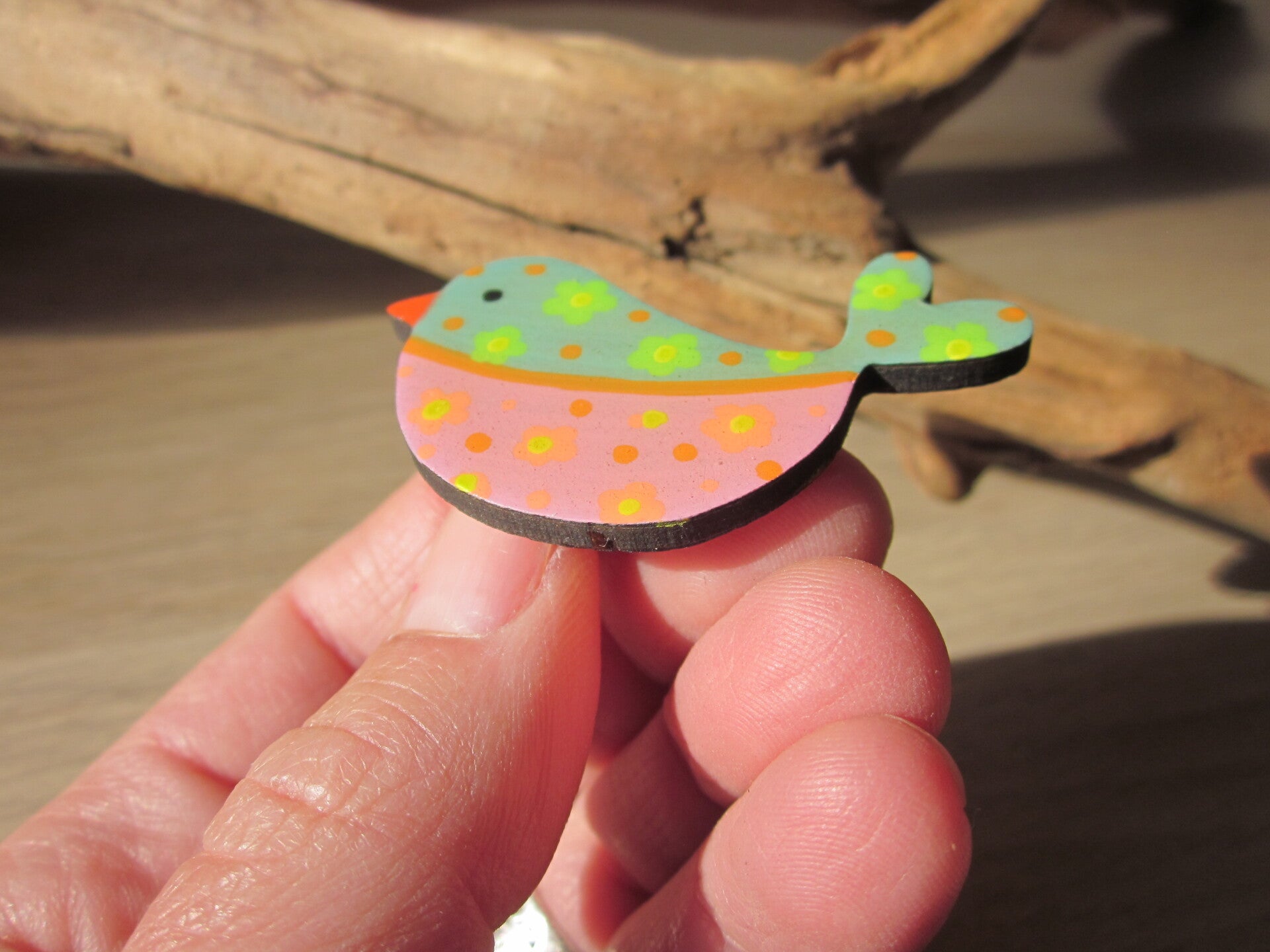 Pins en bois - Oiseau peint à la main - Vert et rose